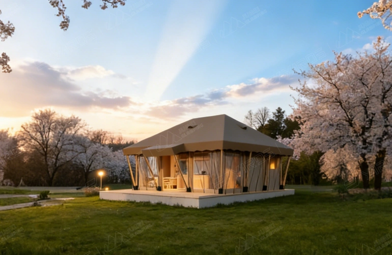 01/19/2021A typical interior and configuration of a 6M glamping dome tent of our projects for resorts and campsites. Including the panoramic window, skylight, solar exhaust fan, air conditioner, bathroom set, etc.