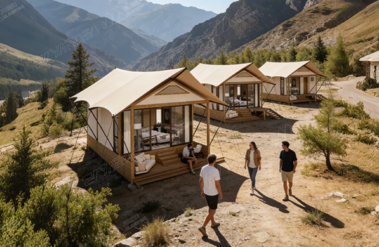 uses steel and wood structure as the frame, with waterproof PVC as the top and canvas or Oxford fabric as sidewalls. It could give the tourists a kind of safari, luxurious and comfortable accommodation facilities when camping in deserts and wild parks.