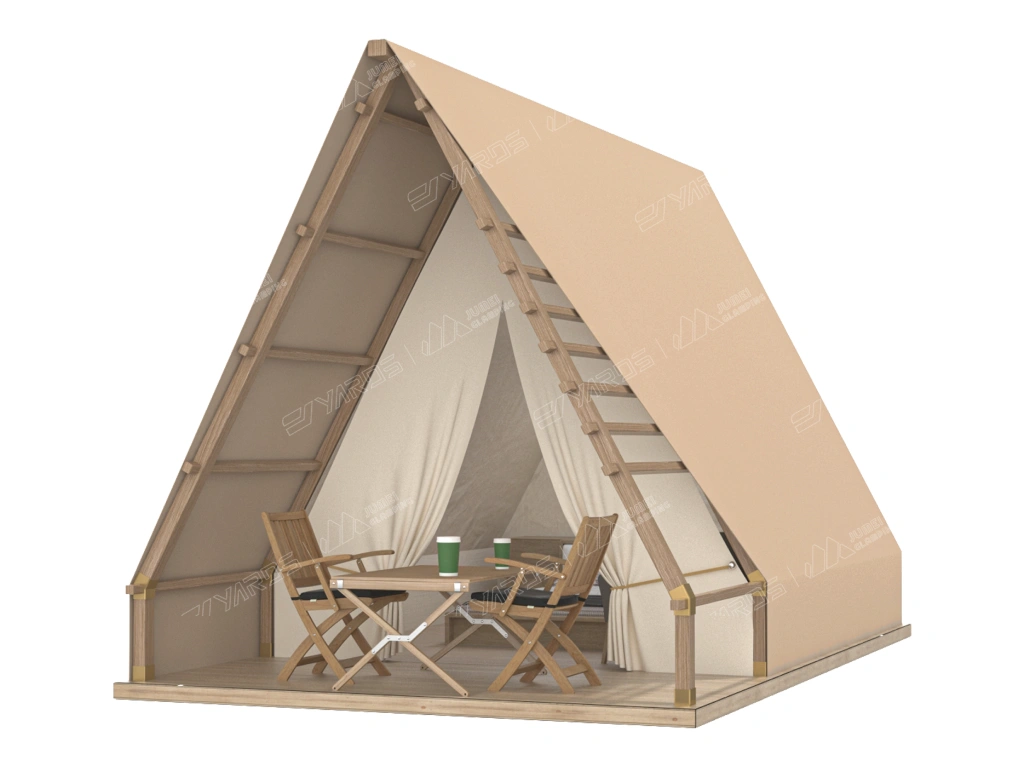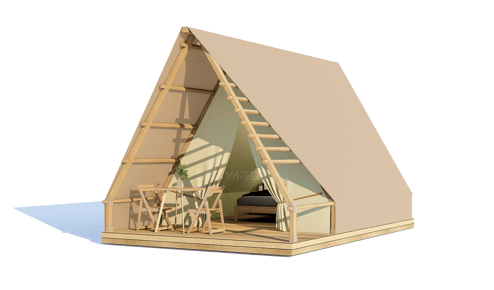 The Basic Safari Tent with Small Veranda – AX17 is a newly developed A-frame style safari tent. Its upgraded design features an increased height and a cozy front veranda, perfect for setting up two lounge chairs and a small table. This inviting outdoor space is ideal for couples to relax with a drink in the early morning or evening while taking in the stunning views just outside the tent.