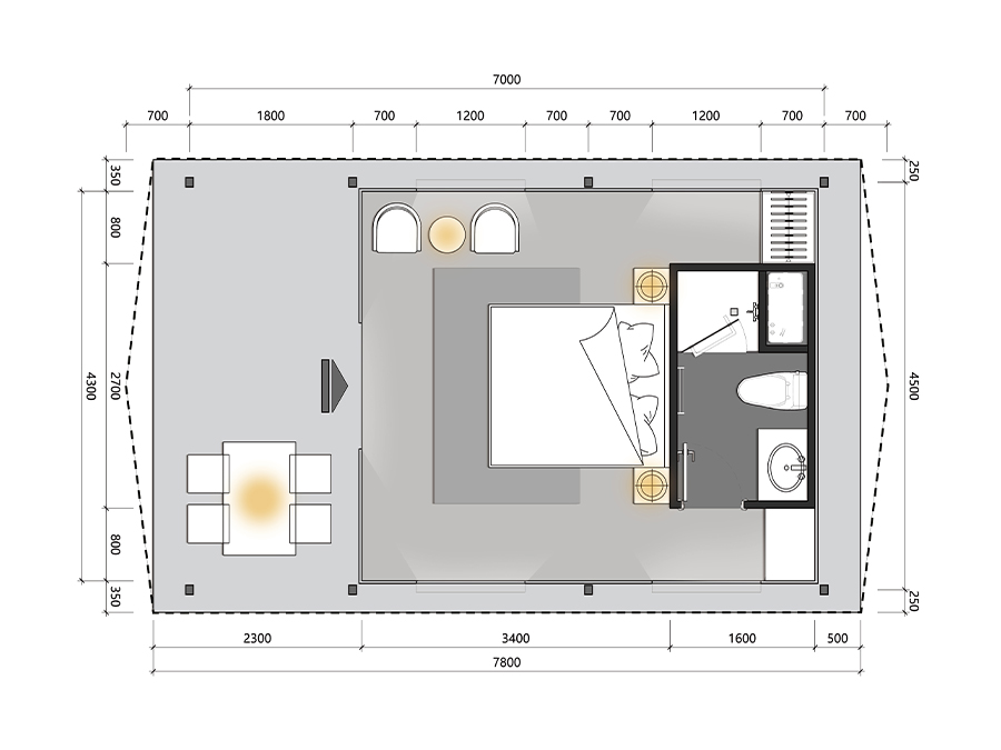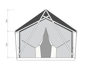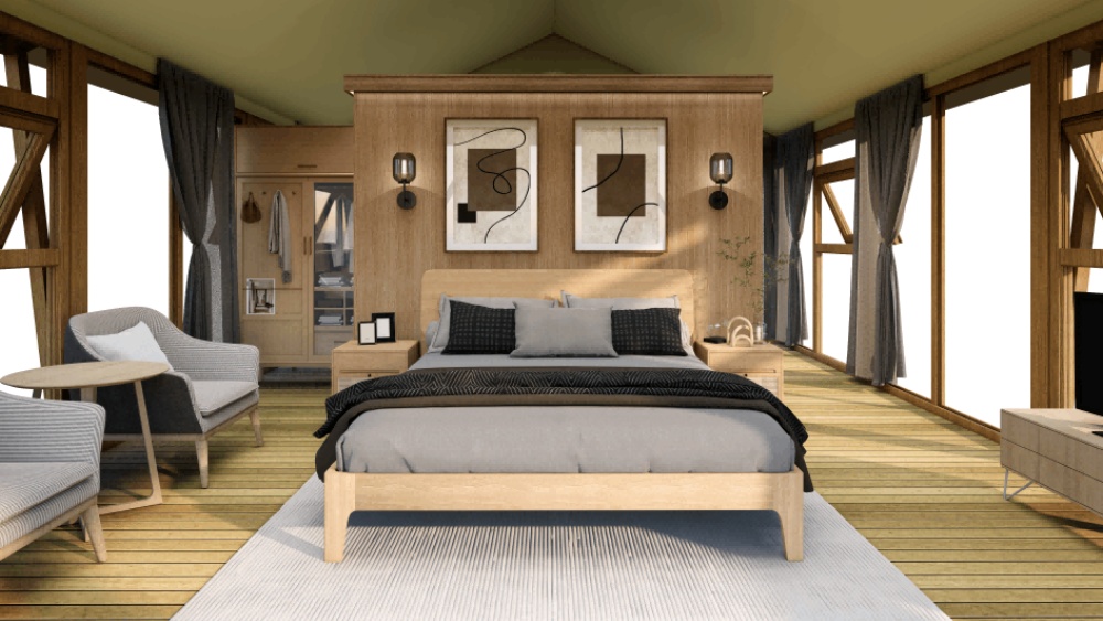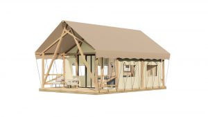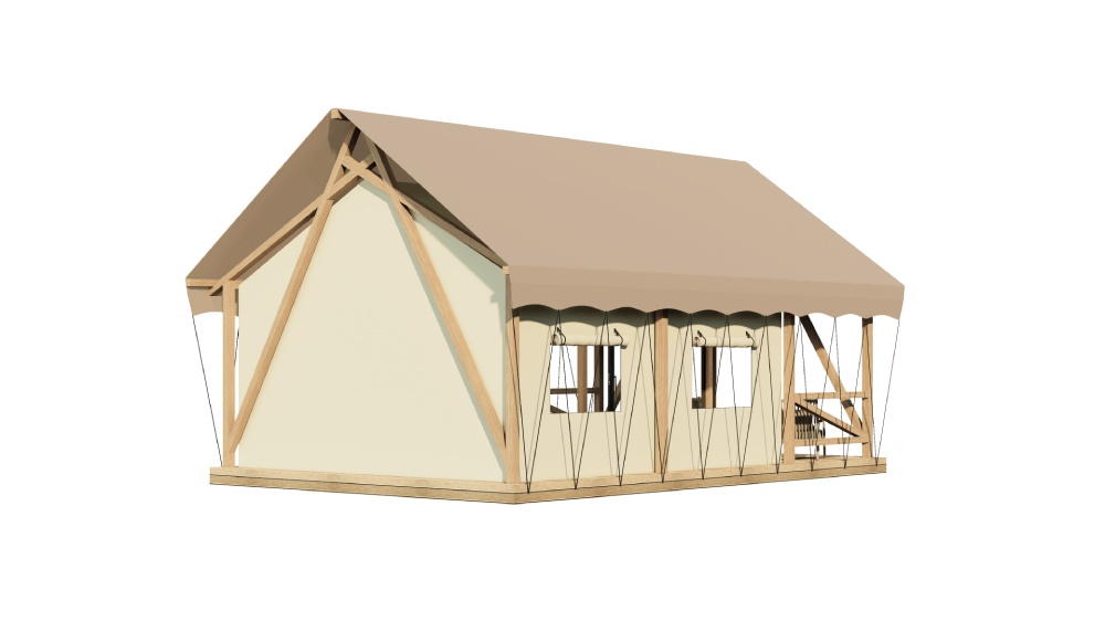 This E-Series safari tent features an expansive front deck, a PVC membrane roof, and high-quality canvas sidewalls. A glass sidewall option is also available, allowing the structure to be upgraded into a bright sunroom. Its square solid-wood columns create an open, adaptable interior and give the tent a distinctive architectural character. Both the PVC and canvas materials are carefully selected for performance, offering flame retardancy, full waterproof protection, UV resistance, tear strength, and excellent self-cleaning properties.