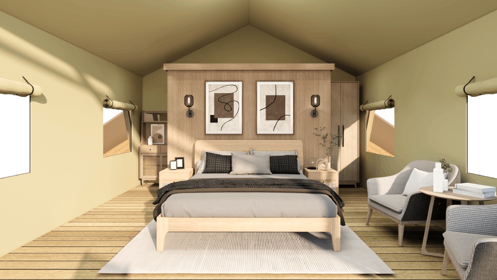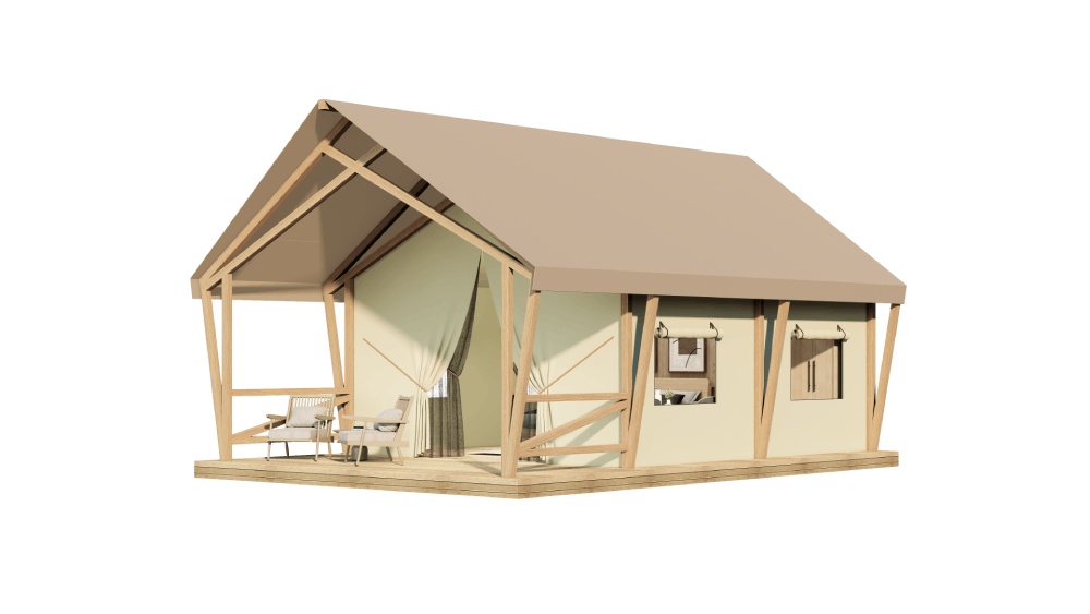 EC32 New Classic Safari Tent with Glass Door & Walls represents an elevated evolution of the traditional luxury safari tent. By replacing the side ropes with square-section solid wood poles and upgrading the front door and wall panels to full glass, the tent achieves a cleaner, more refined, and premium visual style.