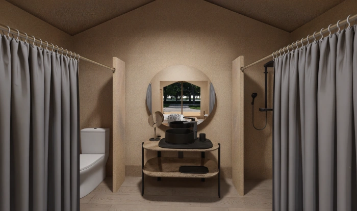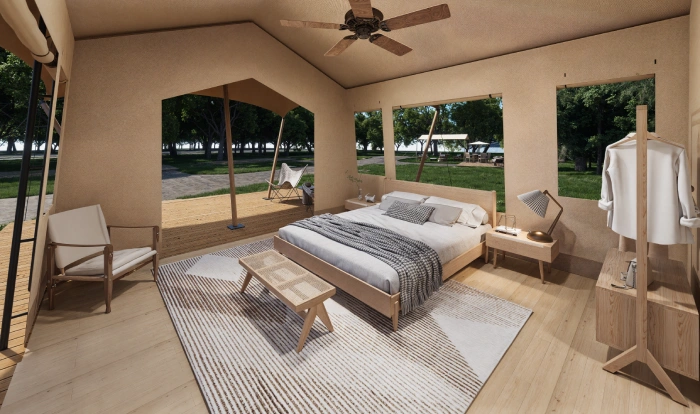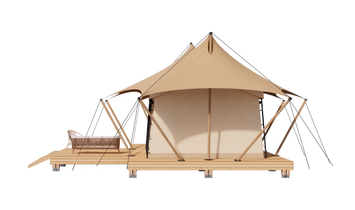 GP28 luxury tent is a high-end modular getaway that redefines traditional construction concepts. Its adaptable framework suits a wide range of landscapes—from mountain slopes and open meadows to desert plains, lakeshores, and seaside locations. Featuring fast setup, optimized investment cost, durable performance, and easy relocation, this refined tent offers a versatile solution for upgrading any outdoor destination.