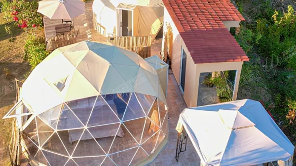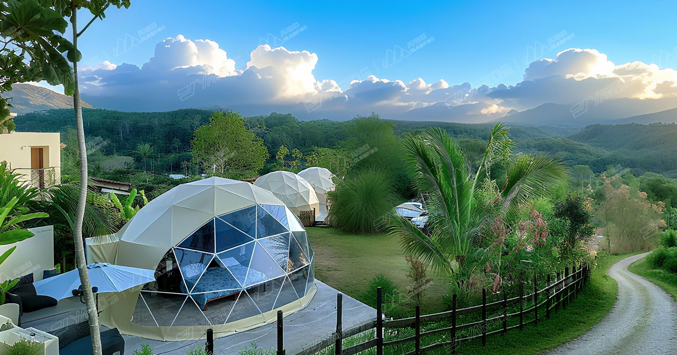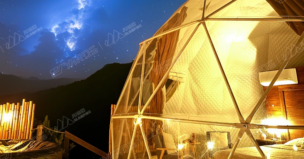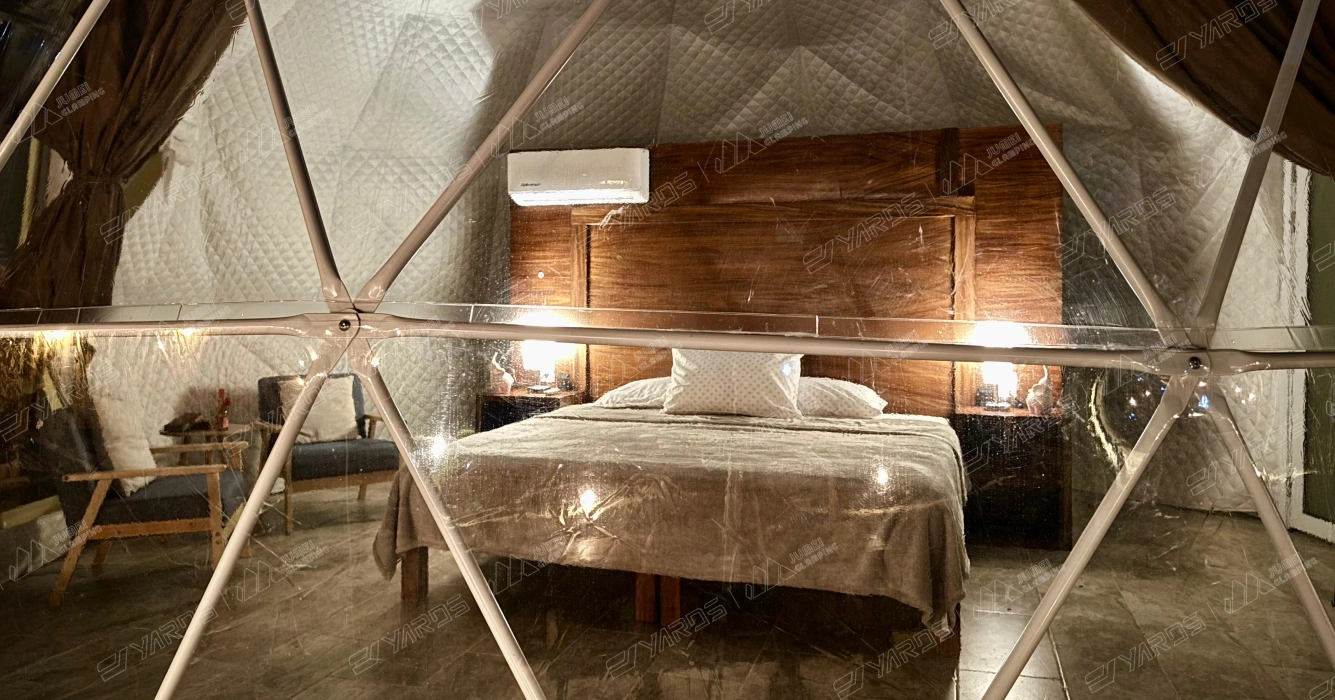 The resort features three starlit Glamping Domes, seamlessly combining modern comfort with a refined sense of nature. Each tent is fully equipped with contemporary amenities, offering guests a unique stay where the allure of the wild meets the comfort of a premium retreat.
