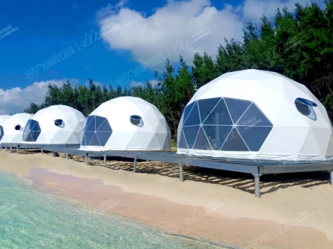 The color of fabric can be white, yellow, green and so on. We provide customized design and various accessories for glamping dome tents, including doors, flooring system, inside heat insualition cotton, air conditioner, windows, bathroom accessories, home appliances, and ventilation systems. Glamping dome tent has become more and more popular for building a unique glamping resort.
